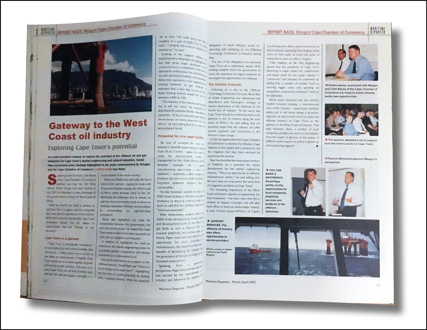 It was an exciting time back then as I attended a seminar that essentially sparked the establishment of the Cape Oil and Gas Initiative (COGSI) which evolved into the South African Oil and Gas Alliance (SAOGA) that we know today. Wesgro and The Cape Chamber of Commerce had recently released a report that they had commissioned to investigate the opportunities offered by the then growing offshore oil industry on the west of Africa.