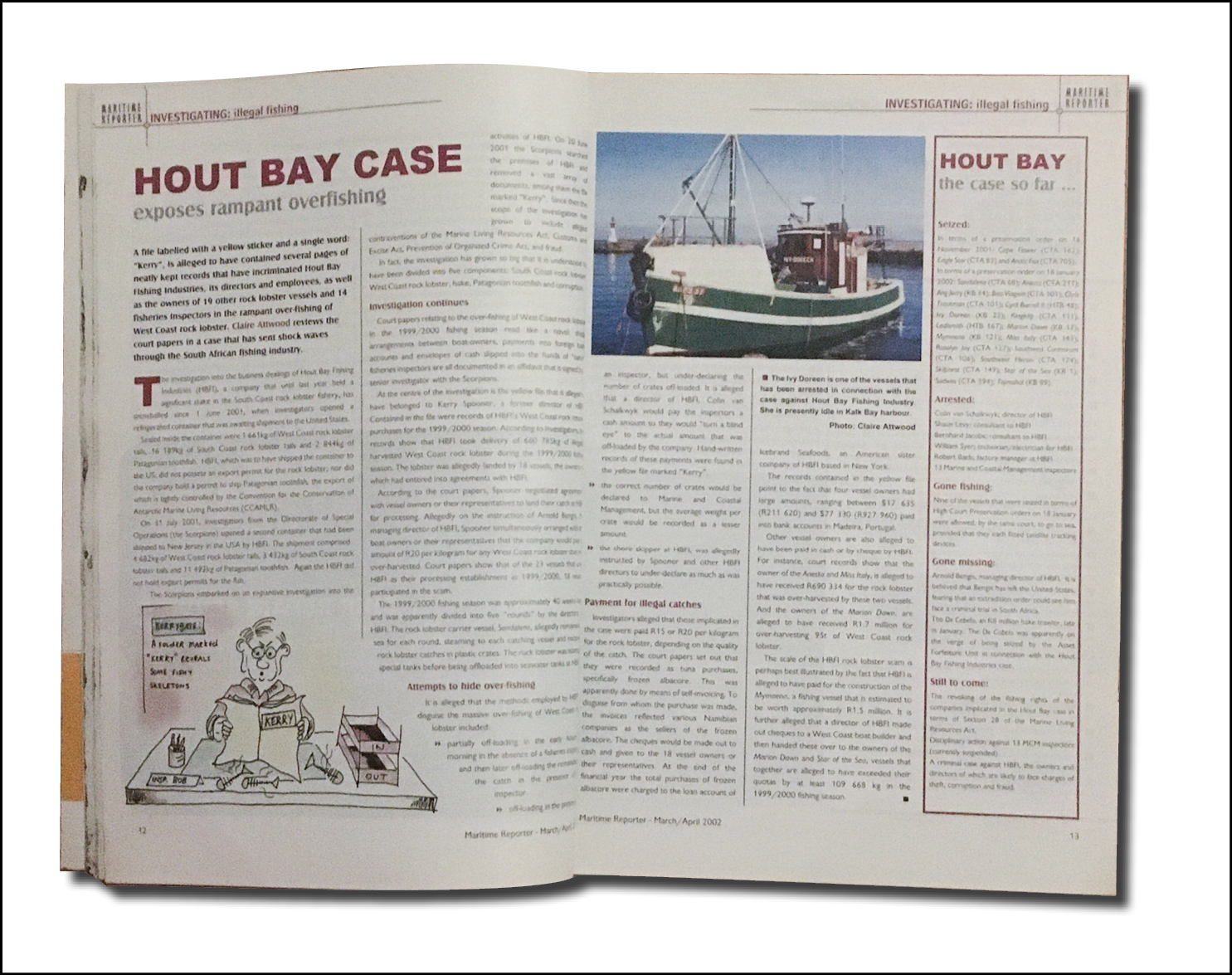 The last main feature story related to the Hout Bay fishing saga. Our fisheries editor at the time, Claire Ward (Attwood), caught our readers up to speed with the developments around the secret file that had been discovered that essentially incriminated Hout Bay Fishing Industries, its directors and employees as well as the owners of 19 other rock lobster vessels and 14 fisheries’ inspectors in the rampant over fishing of the west coast rock lobster.